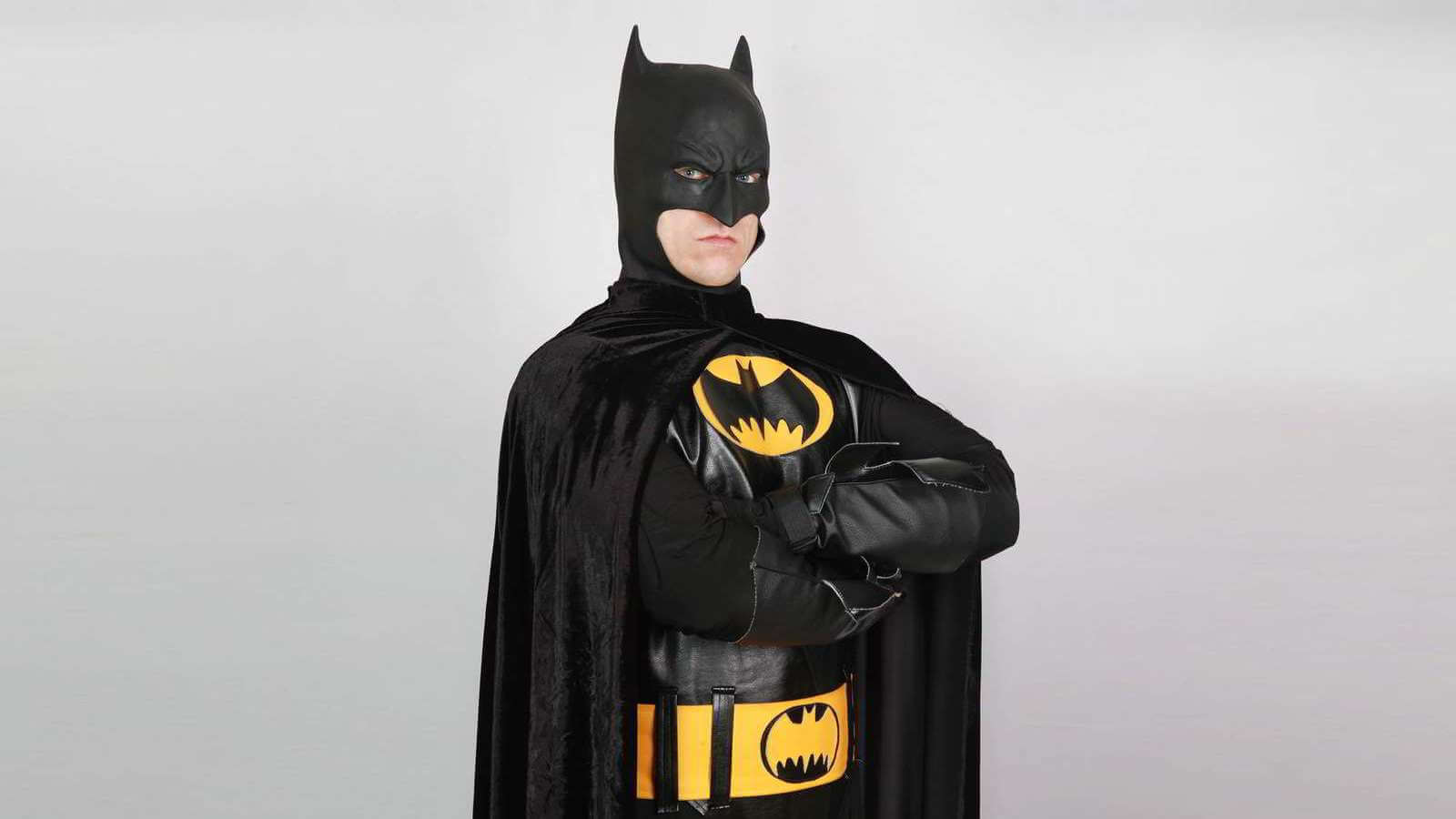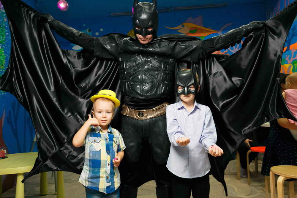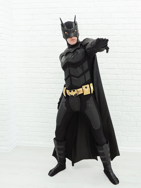 Стильный визуальный ряд. Чёрный костюм, маска, символы летучей мыши создают эффектный образ и отличные фото.